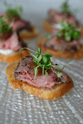 Rare beef croute, sweet onion puree, horseradish cream, watercress and crisp shallot